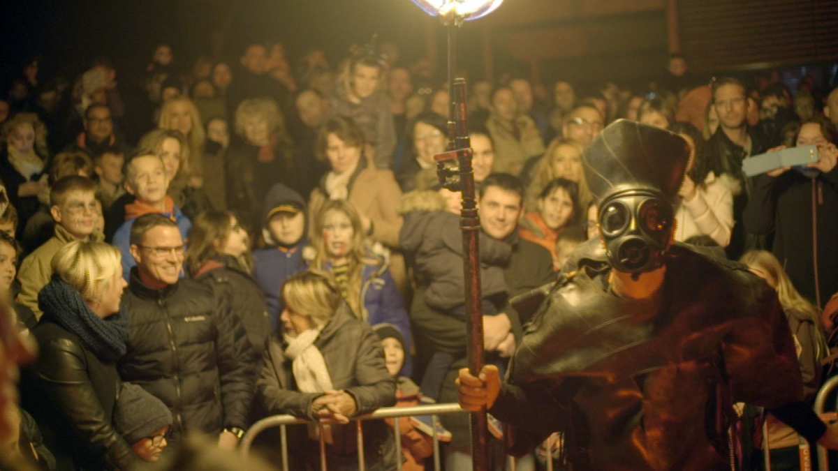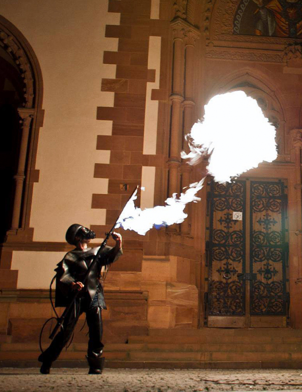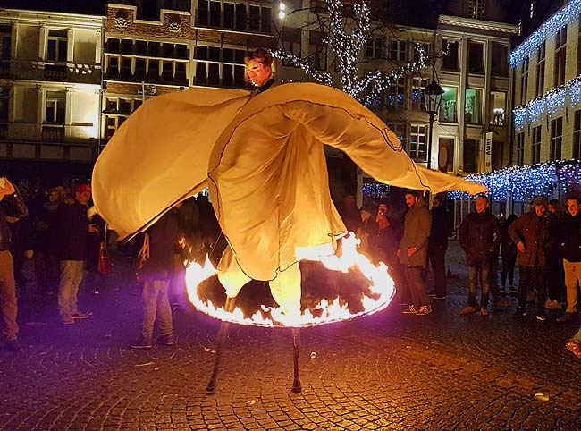 Een vurige dans en een fascinerende choreografie van fladderende vleugels spectaculair verlicht door heet vuur. Dreigend begeleidt door een demon met vlammenwerper. Als die detoneert galmt een diep geluid, die je voelt tot in je maag. Maar na de schrik volgt onmiddellijk de bevrijdende lach. Het is maar theater!