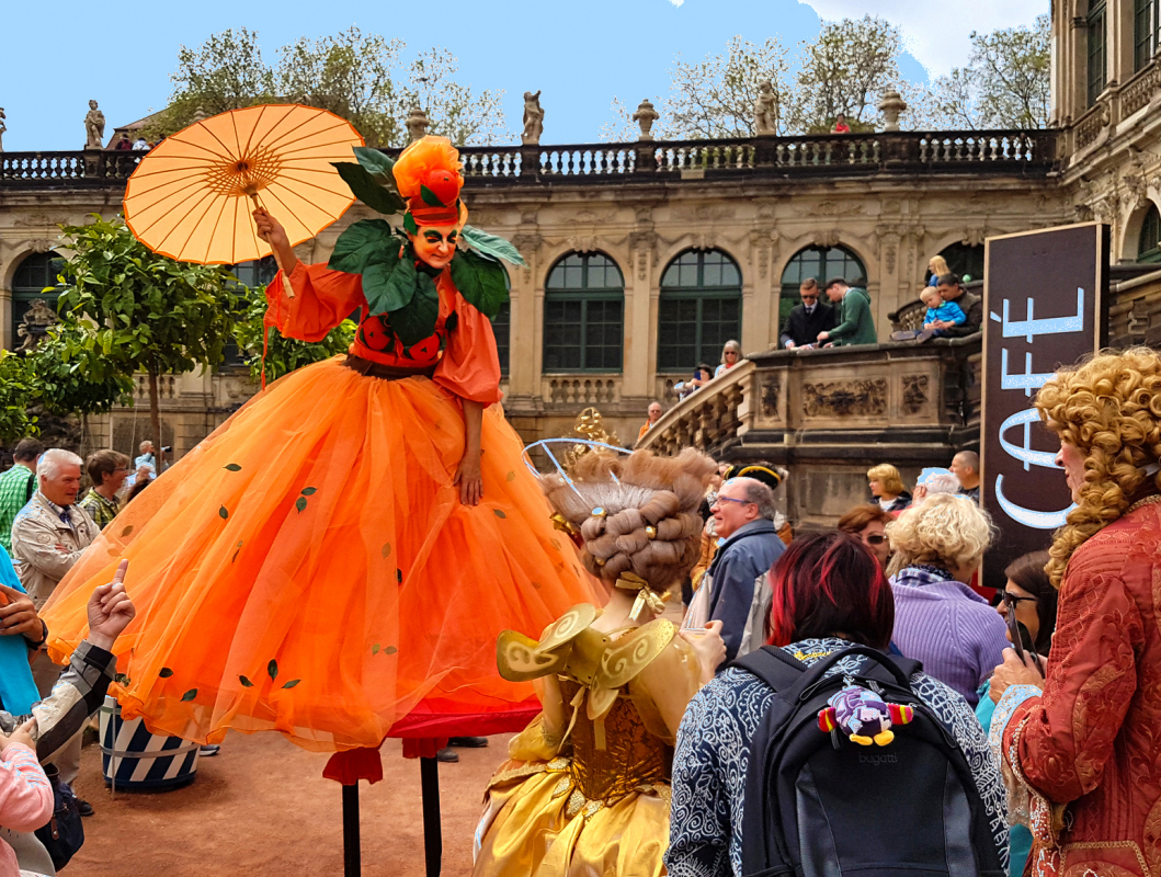 Deze voorstelling is oorspronkelijk gemaakt voor het volksfeest Die Rueckkehr der Orangen in 2017, de feestelijke opening, waardoor de Zwinger in Dresden weer zijn oorspronkelijke bestemming als Oranjerie terug kreeg. Sindsdien zijn ook wij ieder jaar weer daar te bewonderen. Kijk hier waar we verder nog spelen.