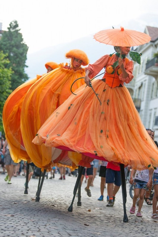 • Trio – Parade met trio op hoge stelten, korte interactieve straattheater voorstelling met sinaasappelveiling, dans en muziek