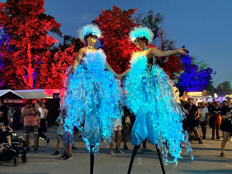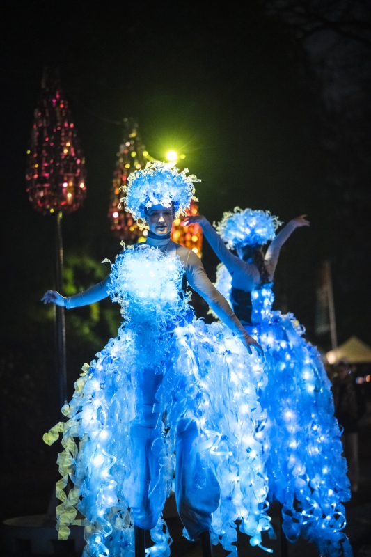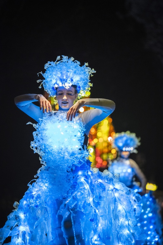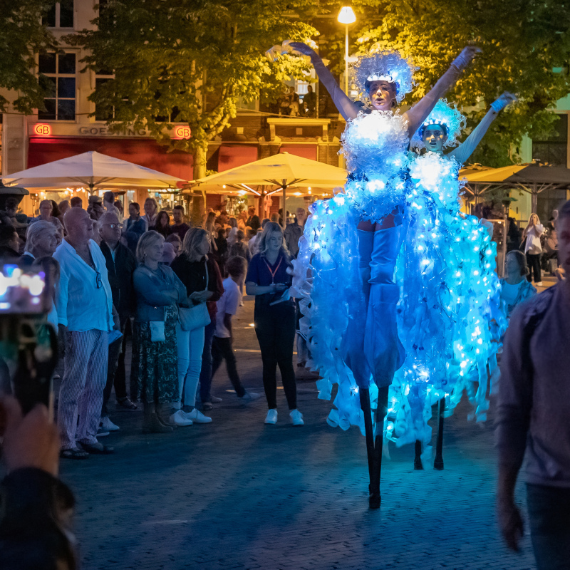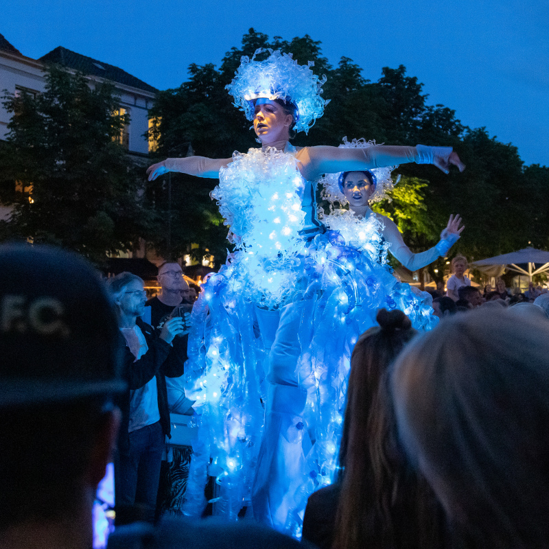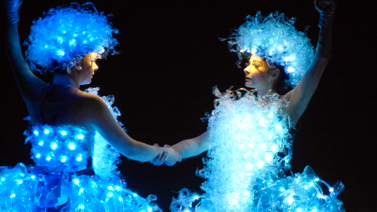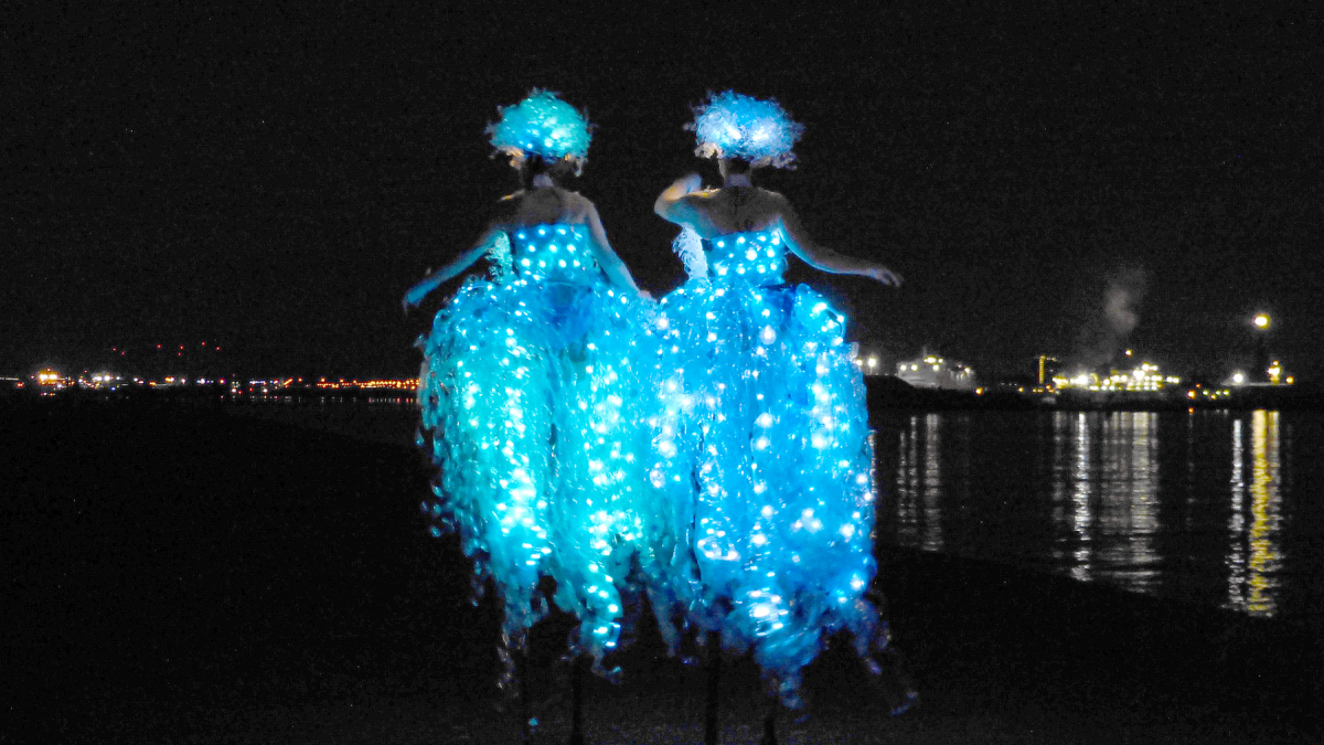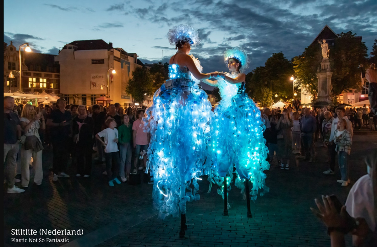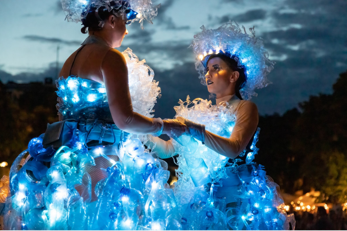 Twee prachtige danseressen, hartstochtelijk dansend op hoge stelten. Ze zijn gekleed in fascinerende, verlichte jurken van…. plasticflessen!