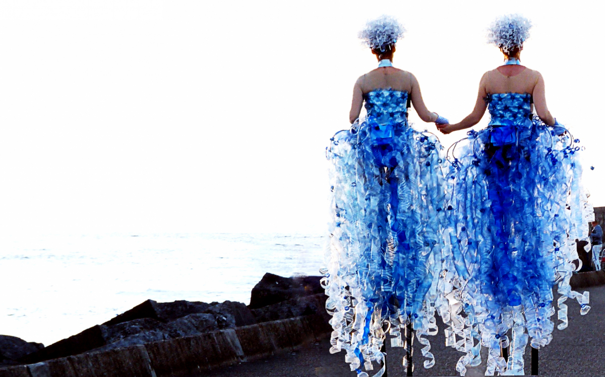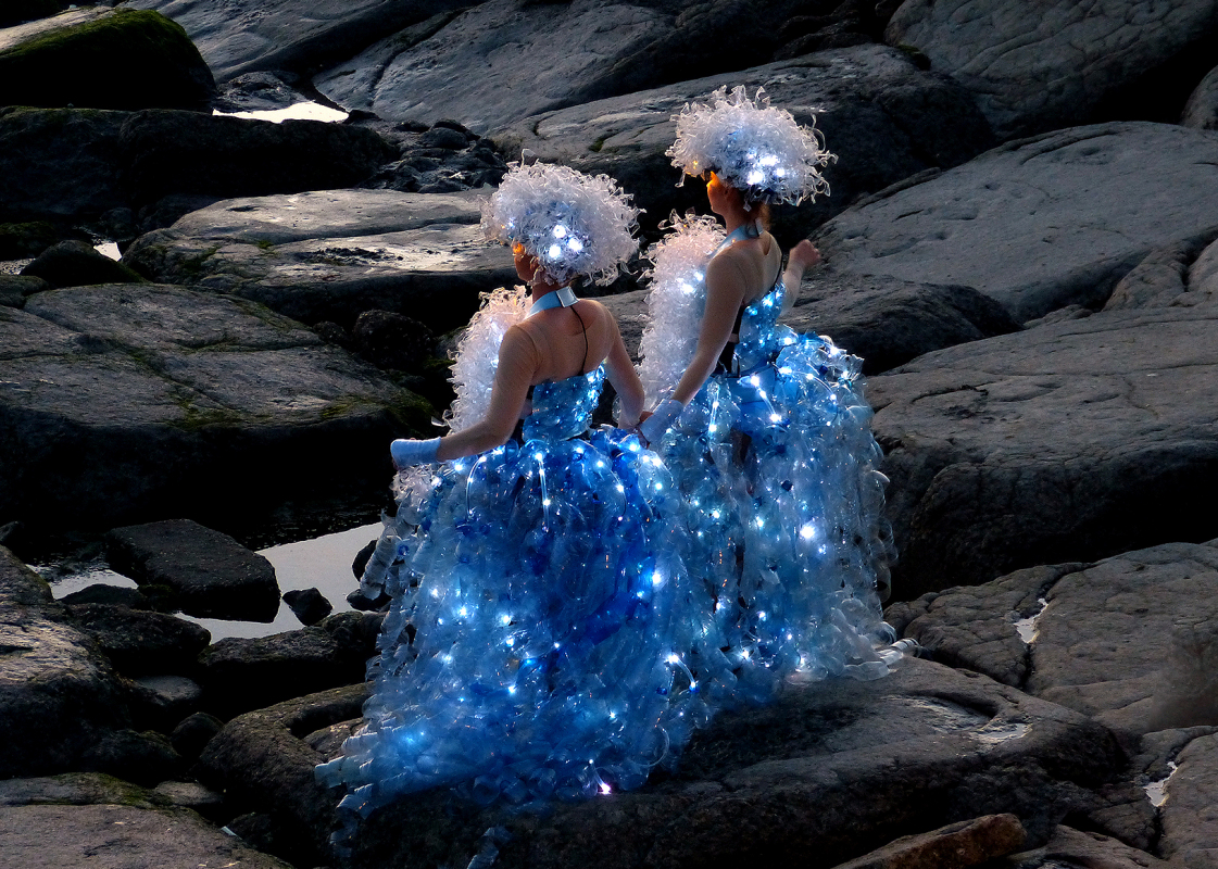 Twee prachtige danseressen, hartstochtelijk dansend op hoge stelten. Ze zijn gekleed in fascinerende, verlichte jurken van…. plasticflessen!